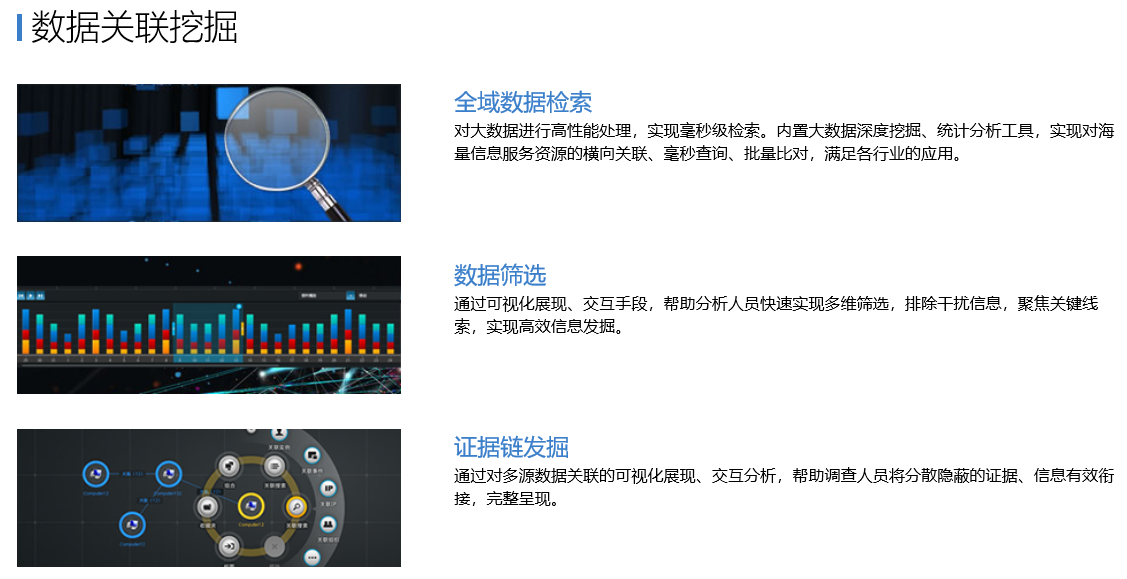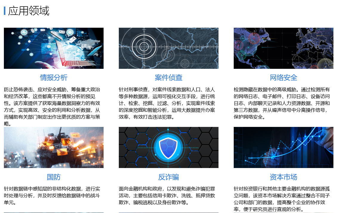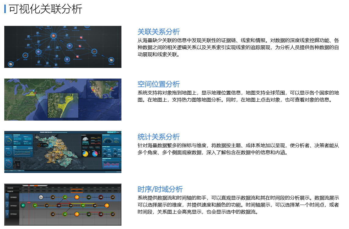 可視化情報(bào)分析平臺,是面向情報(bào)調(diào)查和分析人員的可視分析專業(yè)產(chǎn)品。平臺針對多源易構(gòu)的海量數(shù)據(jù),通過數(shù)據(jù)處理、存儲管理、可視化交互分析等技術(shù),實(shí)現(xiàn)圖形化情報(bào)信息查詢、可視化關(guān)聯(lián)分析、證據(jù)鏈和情報(bào)線索發(fā)掘等功能。平臺旨在利用人的洞察(價(jià)值判斷)把人的思想與計(jì)算機(jī)的運(yùn)算能力結(jié)合起來,通過直觀的可視、交互手段,幫助人捕捉到事物之間的關(guān)聯(lián)線索。平臺可廣泛應(yīng)用于網(wǎng)絡(luò)安全、反詐騙、案件偵查、情報(bào)分析、國防安全等領(lǐng)域。